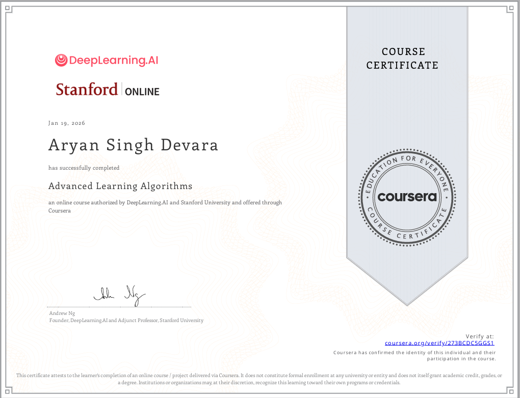 It was a 4-week Stanford Online training program focused on Advanced Learning Algorithms, with in-depth coverage of neural networks, deep learning fundamentals, forward propagation, backpropagation, activation functions, and multiclass classification. The program emphasized the mathematical intuition and algorithmic foundations behind training complex models using gradient-based optimization.